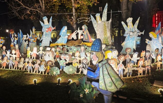 L’opera, firmata dal celebre artista genovese, propone una rilettura poetica e immaginifica della tradizione natalizia: i personaggi della Natività convivono con figure tratte da fiabe e racconti popolari, dando vita a una rappresentazione ricca di colore, fantasia e suggestione.